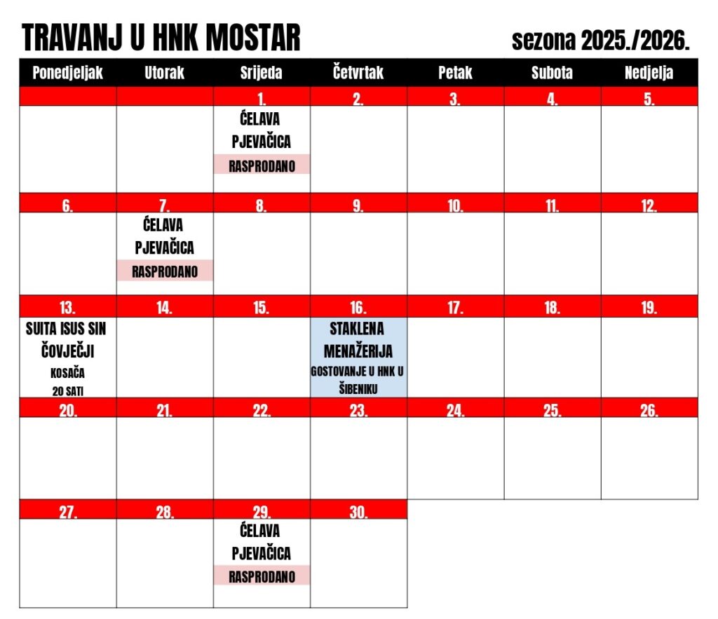 Sve predstave počinju u 20 sati, osim ako nije drukčije navedeno.